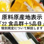 食品表示で原料原産地表示が義務付けられている「22食品群+5品目」とは。食品表示検定上級資格者がわかりやすい具体例とともに解説いたします。新しい原料原産地表示制度の基本のルールとともに、「22食品群」と「5品目」の例と個別規定のポイントをまとめた解説記事です。